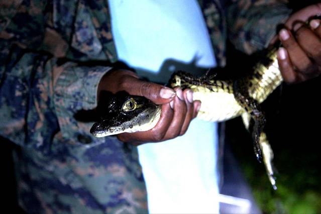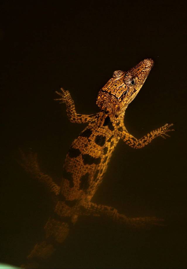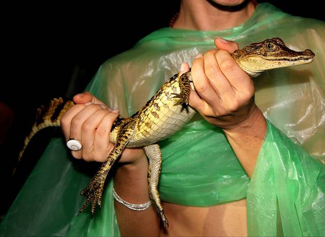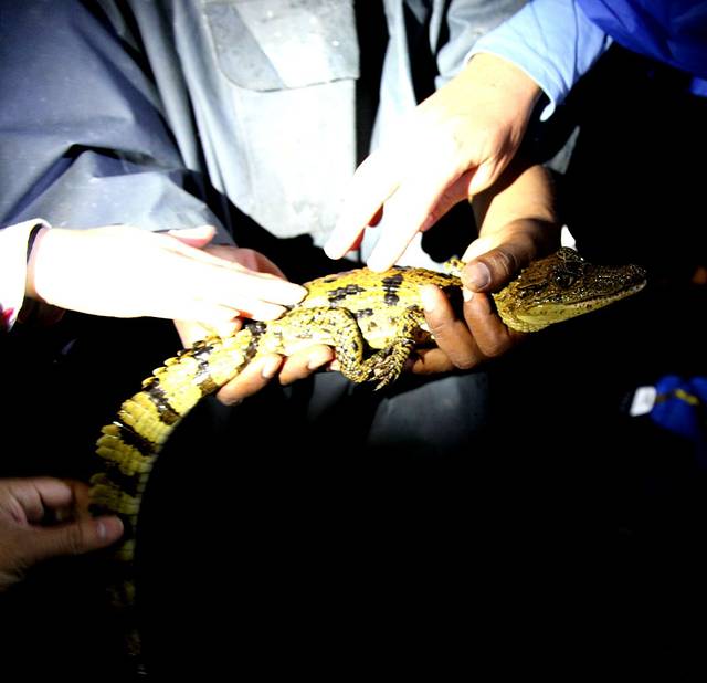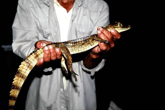 游荡了半天,最后终于让Rafa在一个苇塘子里面逮到一只小鳄鱼。大家开始还有些惊愕,可是小鳄鱼刚被拿到灯光下,立刻就有千万只罪恶的手伸过去。可怜啊。据说这只大概有两岁大,而凯门鳄可以活到四五十岁,所以它只是个baby。