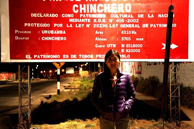 天不久就黑了,我们的小车飞快地翻过一个又一个山头。途中经过Chinchero小城,本来原计划是在这里逛逛集市的,现在人家早关了,就只能在路牌底下照张相了。这里海拔3765米,原来那天凌晨从Cusco赶去Ollantaytambo坐火车的路上,还经过过许多海拔更高的城市,当时都没有感觉。