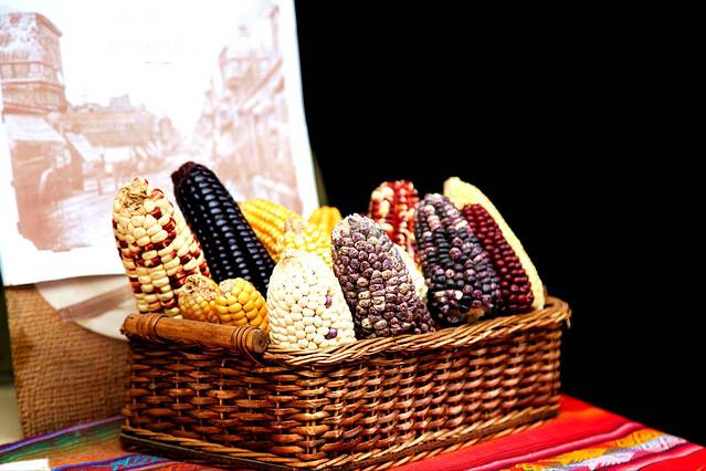 9点多,出了点太阳,立刻暖和了一些。顺着广场边的街道走去Monasterio de San Francisco教堂。路上看到一家餐厅门口陈列着各种不同的玉米,开眼界了,玉米还有这么多种颜色,我原来就知道黄的和白的。