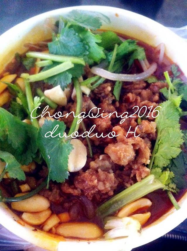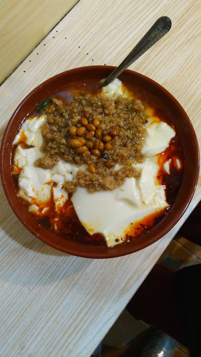 ▲豆花面。最后那天早上我和我妈一人吃了一碗小面后,走在路边看到豆花面。我其实很饱了,我妈要尝一尝就买了一碗。就吃了一次。但是绝对值得!建议大家碰到的就去点一份,我吃的这家就在洪崖洞上面的街道,店铺名字我真没注意,味道是一百个赞!因为我已经吃饱了的情况下我还觉得它很好吃~那味道大家自己体会~酱豌豆和肉末酱铺在豆花上吃的时候混合着小面的麻辣红油汤~有机会的话别错过哦~