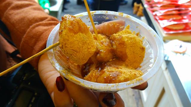 ▲磁器口买的糍粑,和重庆的三大炮味道差不多,我还是很喜欢吃这类甜食的!景点卖6块一份。还有一种小颗粒的糍粑,三块钱一碗,也不贵~软软糯糯~甜而不腻!