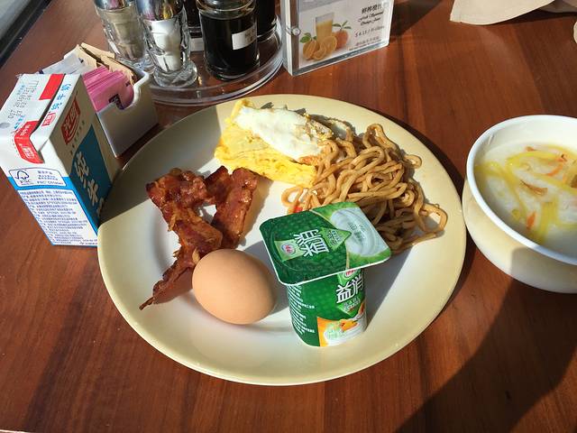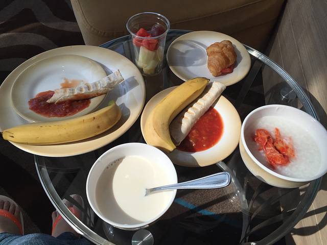 天气很好,吃着早餐跟一起坐的上海一家三口聊聊天
