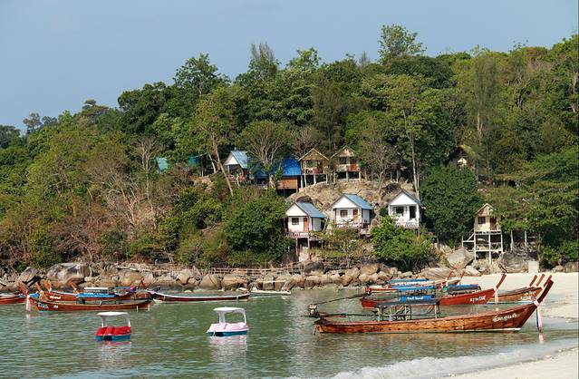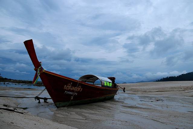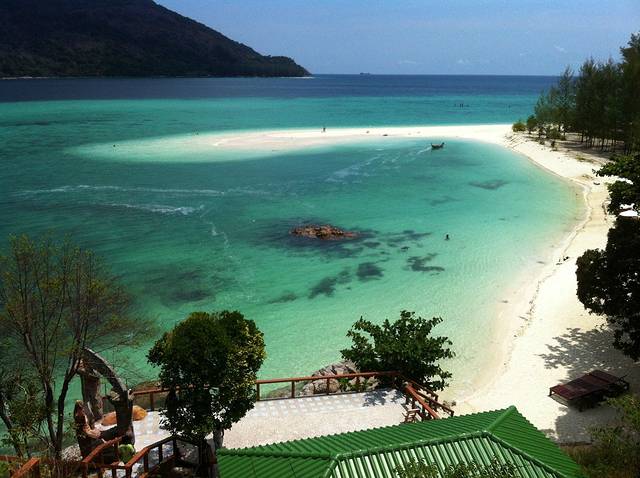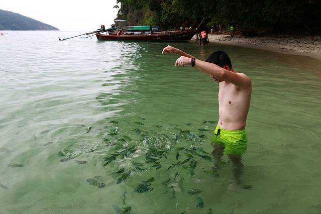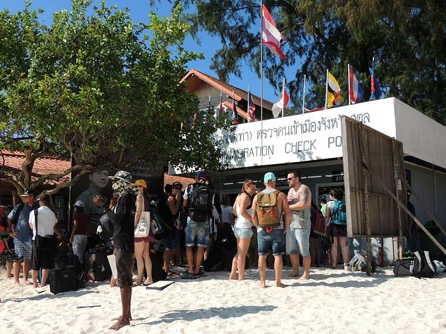 离开马来西亚兰卡威,两小时后,来到泰国迷人的丽贝岛,大船不能靠岸,用小船摆渡到浅滩,旅客涉水上岸,这可是入境啊,跟偷渡似的。