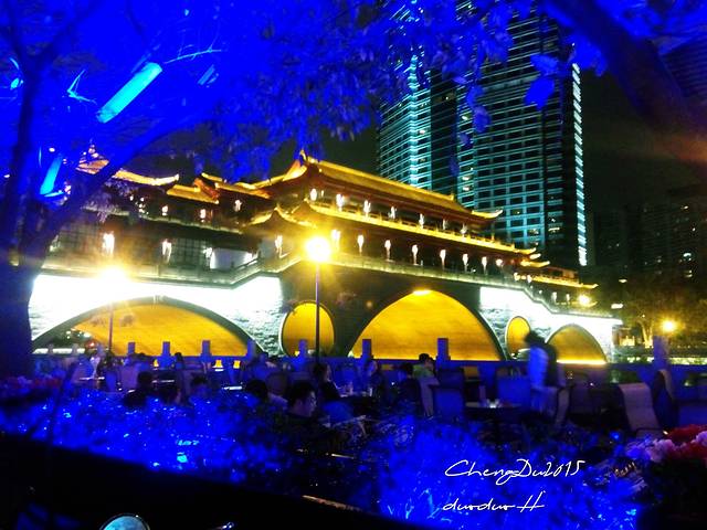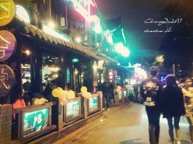 白天在熊猫基地一路都用走的,赶回市区没停逛了宽窄巷子,真的有点累了。又是先回酒店休息了一会。到晚上去春熙路找吃的。看到了龙抄手总店,排队的人太多于是放弃!刚好发现单位同事也在成都,于是他带我们去九眼桥逛逛!哥们说全国各地他只去酒吧!对景点没兴趣~你问他当地酒吧在哪,哪家好他都知道!也是很厉害的好吗~