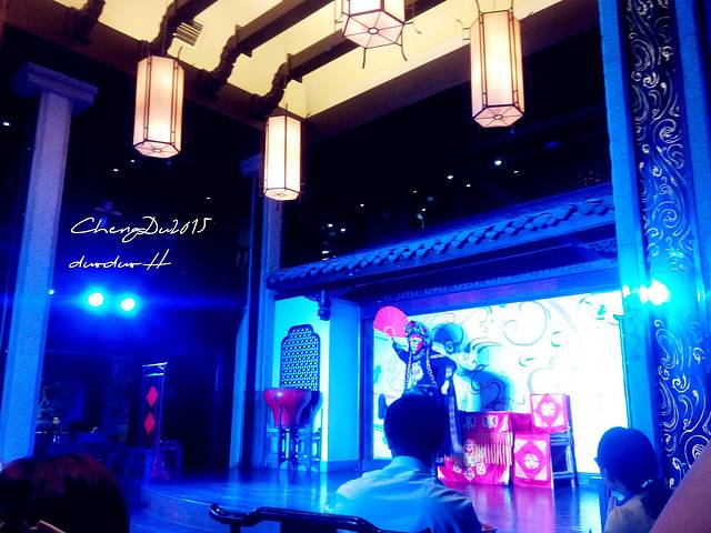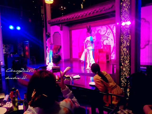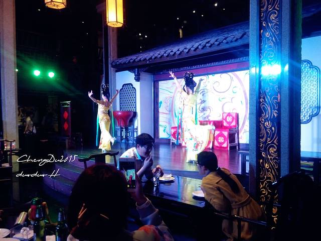 外面看着建筑蛮霸气,装修风格是中式,进去后发现中间还有个戏台,我只顾着吃了!最后胖子才说,我是看这里有表演~还能吃饭才拉着你进来的。好吧我是吃货我根本没注意什么表演我只知道我饿了~里面几乎坐无缺席,生意很好,我们去的算早也只能坐在舞池外圈吃饭。菜价在景区里面,真的不算贵。表演大概在六七点开始。先是三位美女跳了这样一个优美的舞蹈~然后是点燃全场的变脸!互动性好强啊!他真的会到舞池里和大家互动的~就近距离变给你看~里面的人都尖叫不断~变脸完了三位美女中的两位又出来跳了另外一个舞蹈~也不错~最后是个文气的长得还蛮帅的拉二胡~