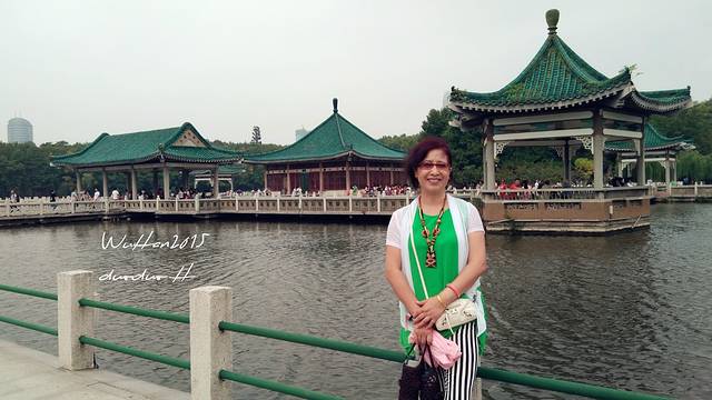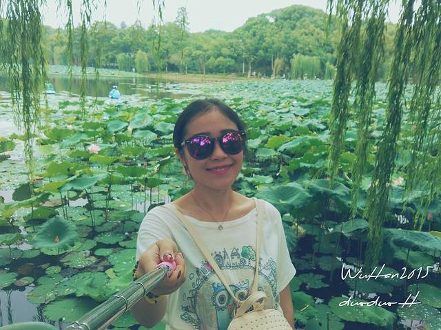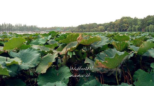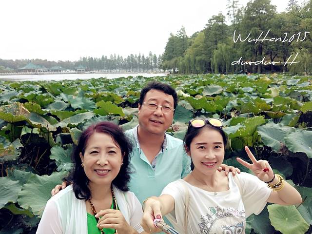 东湖很大!东湖景区被分开成为好几个,听涛、磨山、落雁景区。每个景区之间要坐公交车,很多站才到!北方人第一次觉得玩一个湖上的景区~居然要跑这么远的路!听涛是免费的~磨山和落雁是收费的!我们先去了听涛,是个很大的公园!一进去是个大草坪~往里走就是东湖的分支~有一池荷叶荷花很漂亮!湖上有桥和亭子~里面很多人,当地人也比较多,在那吹凉,打牌,跳广场舞的都有。