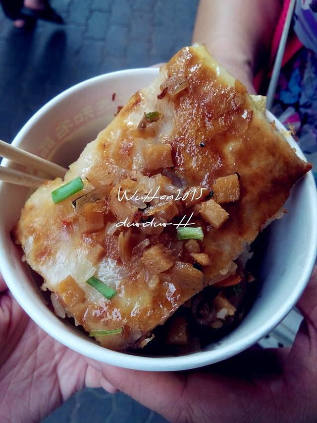 ▶江汉路商圈-三鲜豆皮。江汉步行街旁边的小吃巷子,买的第一份武汉小吃三鲜豆皮。一级棒啊!大家一定要买,老少皆宜啊!老板娘一听我们是来旅游的热情的给我盛了很多下饭的超莲藕块配着豆皮吃~三鲜豆皮是那种能当小吃能当饭吃的美食~我给满分!