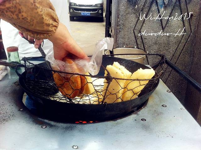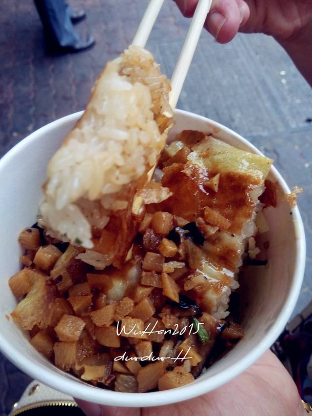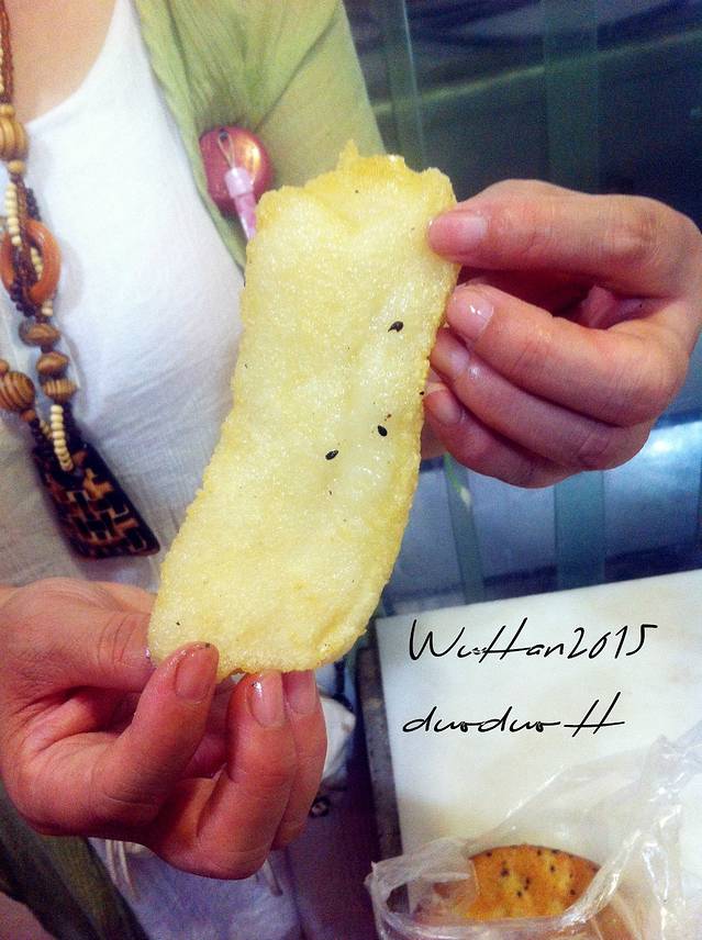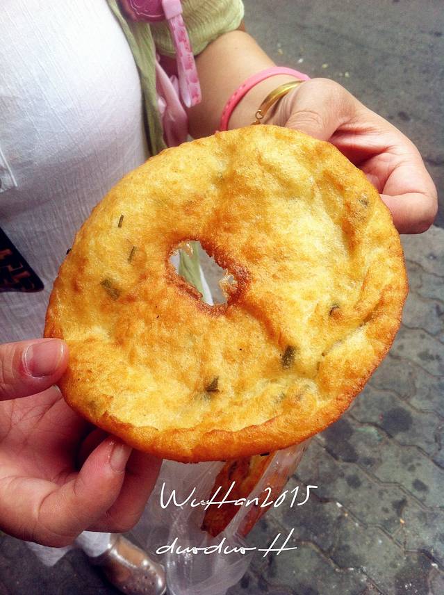 ▶江汉路商圈的早点摊-面窝。我以为是甜味的那种蘸着糖吃的年糕,实际是咸味的,我妈爱吃,糯米的还有江米的。刚炸出来外面酥脆,里面黏糯,微咸~就是有点油大。