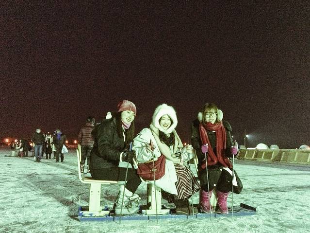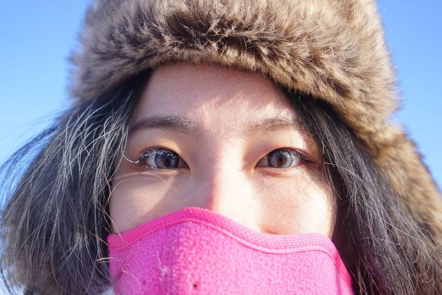 刚开始的时候还特别开心~东拍西拍看看风景哼哼小曲儿,没想到等车开出了人群后,突然开始加速。瞬间那个呼啸的风啊,扑面而来啊~还有被车轮子卷起的冰渣子啊雪啊,我都慌得不知该先护住脸还是相机啊~~所以说,后半程还是很煎熬很痛苦很冷酷无情的!!等我们从轮胎上下来,一个个都变成了雪人。。。