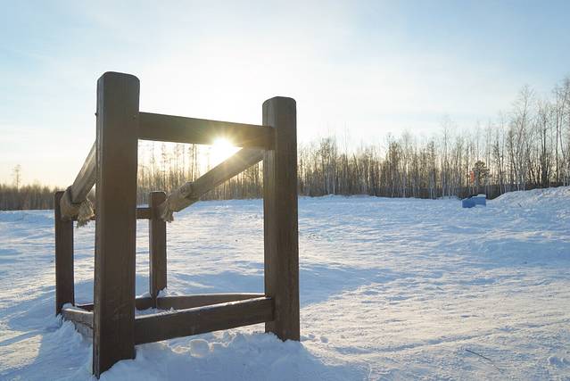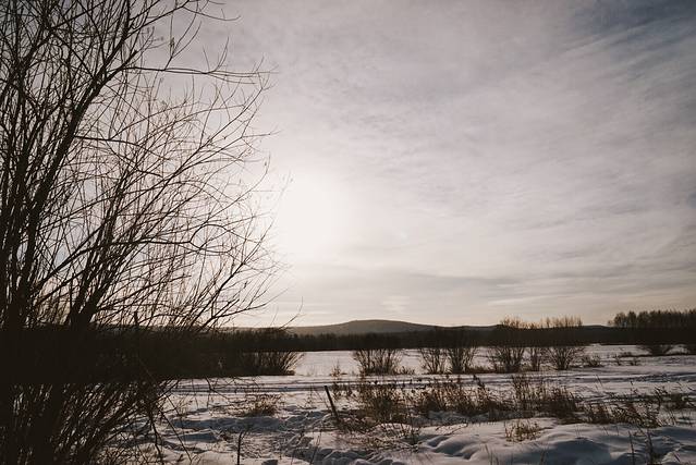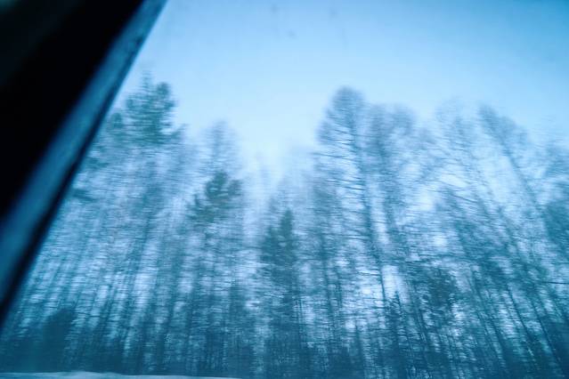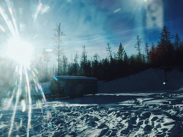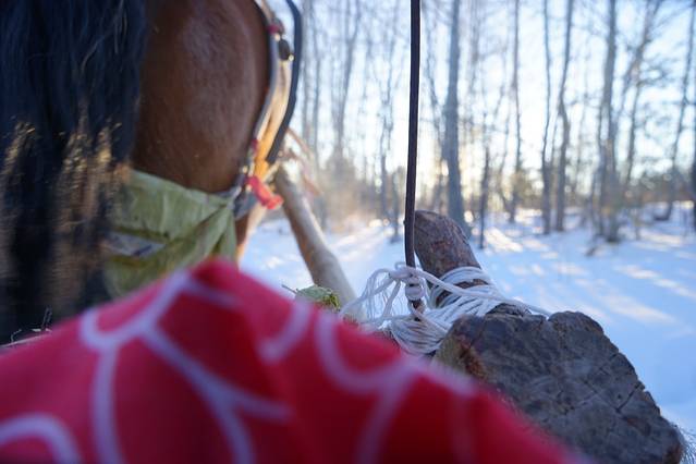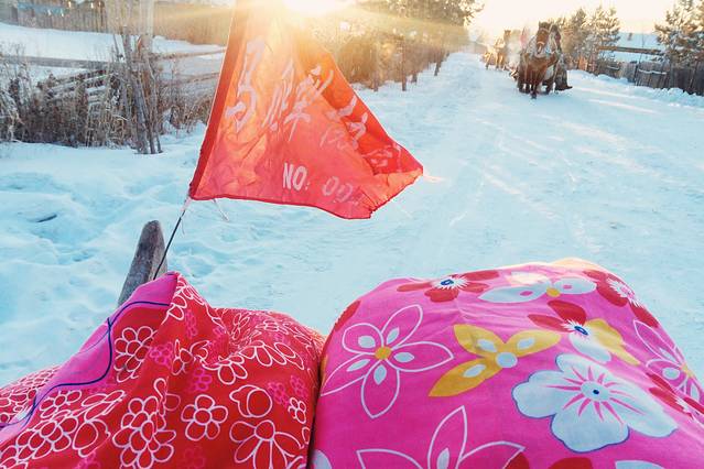 一路上北方呼啸,吹得我们哆嗦了一路,但是这种前所未有的体验让我们几乎忘记了寒冷。虽然刚躺上去的我们有点不适应,因为路上的颠簸程度真的可以把我们颠下车~所以我们刚开始时都直挺挺地躺在车上,望着头顶交错而过的树杈~我还打趣说我们就像红楼梦里的王熙凤那麻布裹住的尸体一路被拖着前行。