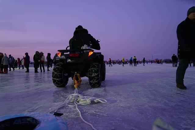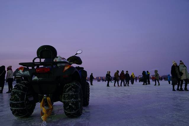 其实就是一辆越野拖着坐在轮胎上的我们在冰上跑一趟~