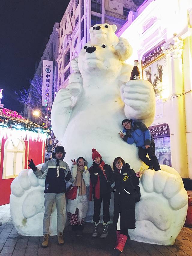 晚上的中央大街美到不行,而且因为是深夜,路上都没有什么人~我们几个上蹿下跳各种与冰雕合影玩的不亦乐乎~当然也迫不及待的买了传说中的冰糖大草莓和马迭尔冰棍吃~