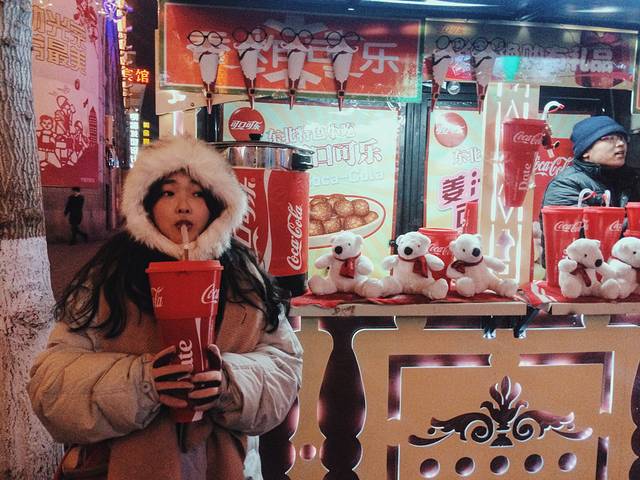 吃的饱饱的,一路步行准备去夜访圣索菲亚大教堂。路过中央大街,买了杯巨大的热可乐去去寒气~~第一次喝热的可乐真是太神奇了。