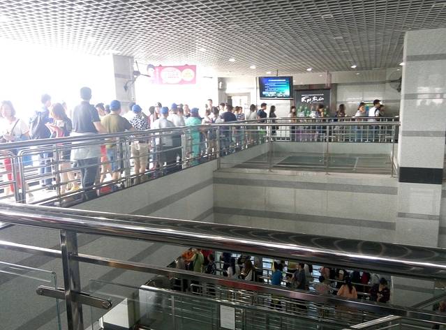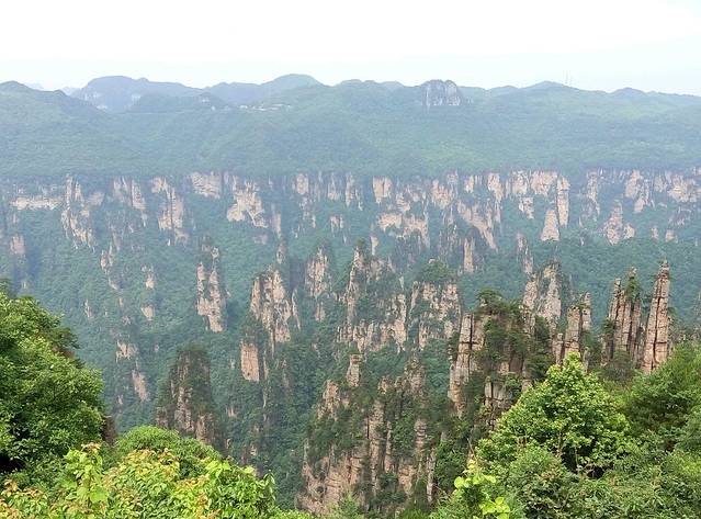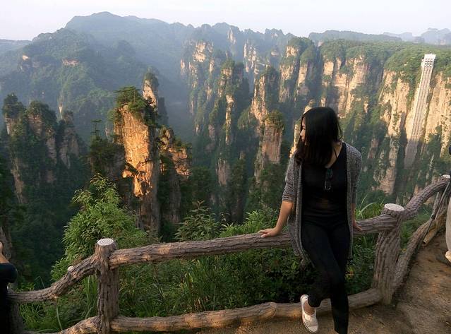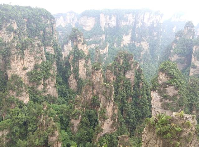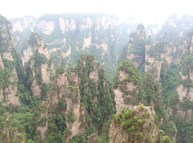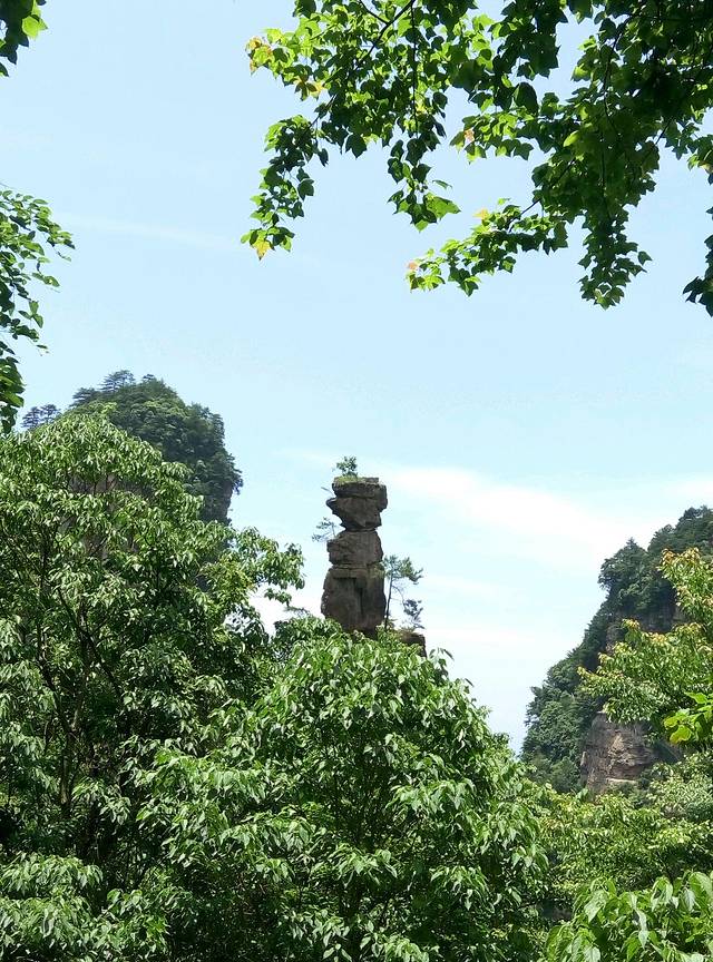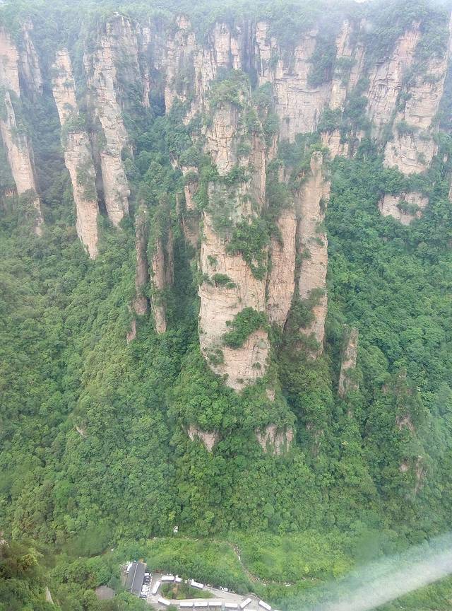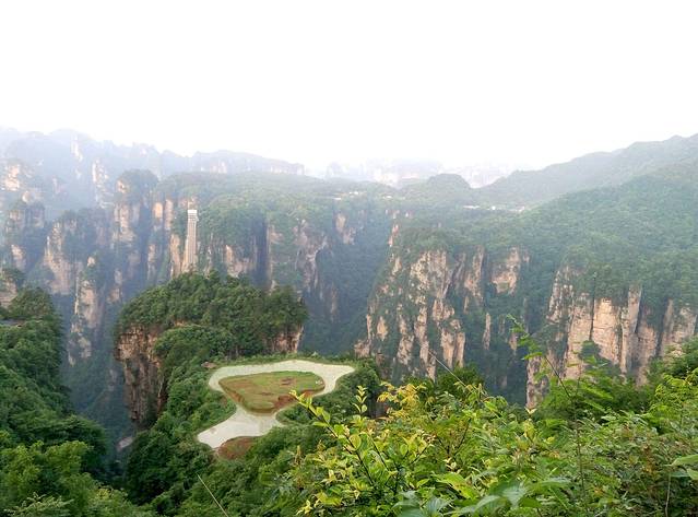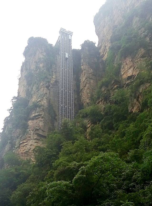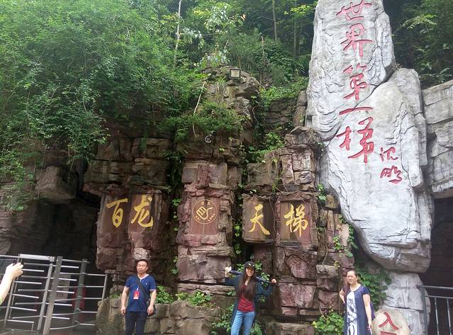 百龙天梯是从森林公园登上袁家界最为快捷的方式。天梯气势恢宏,垂直高差335米,运行高度326米,采用三台双层全暴露观光电梯并列分体运行,被誉为“世界上最高、运行速度最快、载重量最大的电梯”。也是张家界国家森林公园的出名标志性风景,怎么可以不尝试一回,单程票价72元。听说平常会很多人排队,可能我们不是节假日去,又下午2点多,所以人不多排了10分钟不到,还站最外面天梯升的时候好好欣赏风景,但是很快到了2分钟不到,太快了!但是到顶俯视下去还真会脚软,好高呀。。