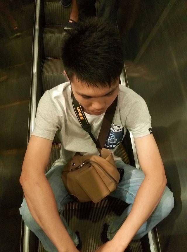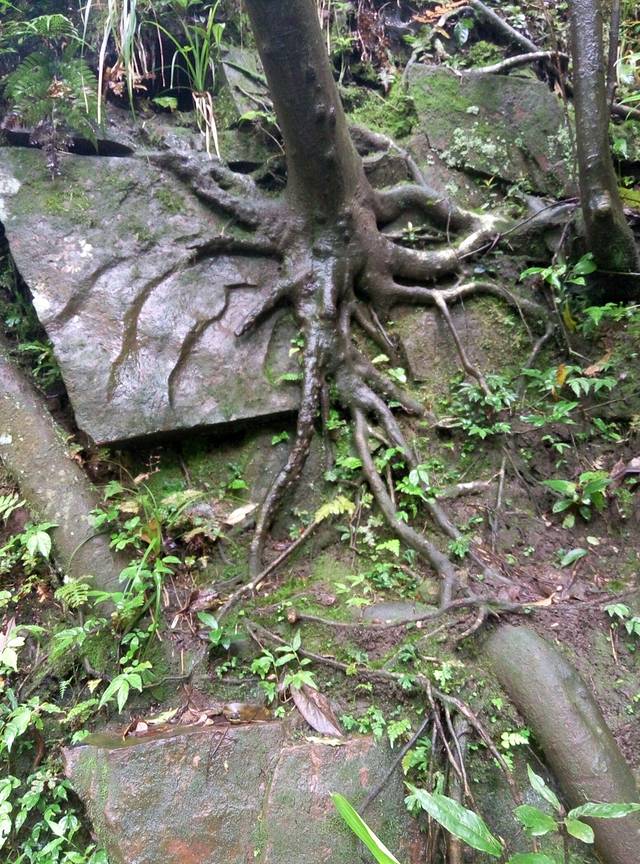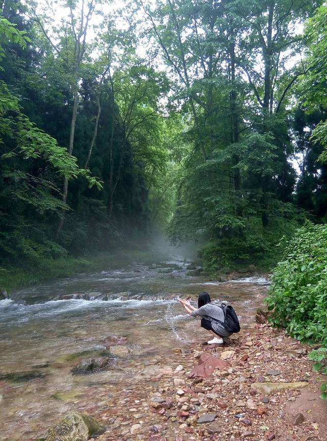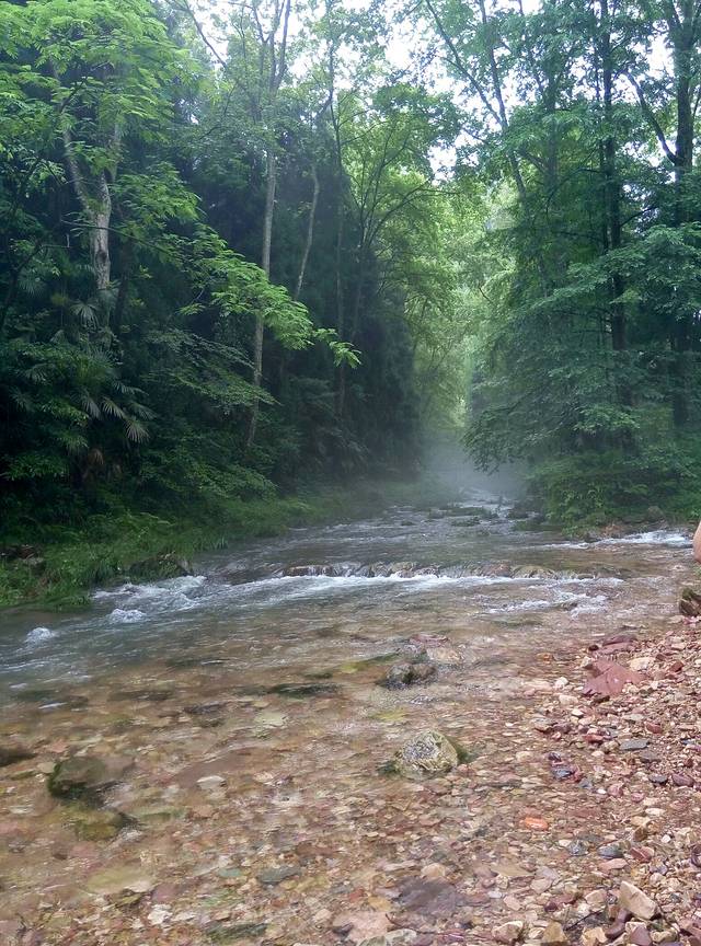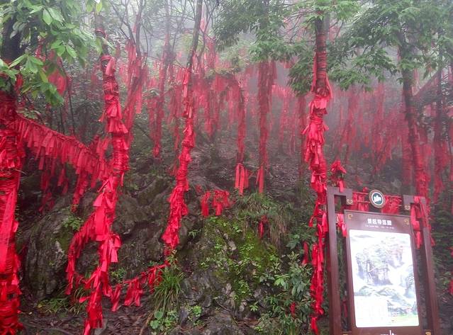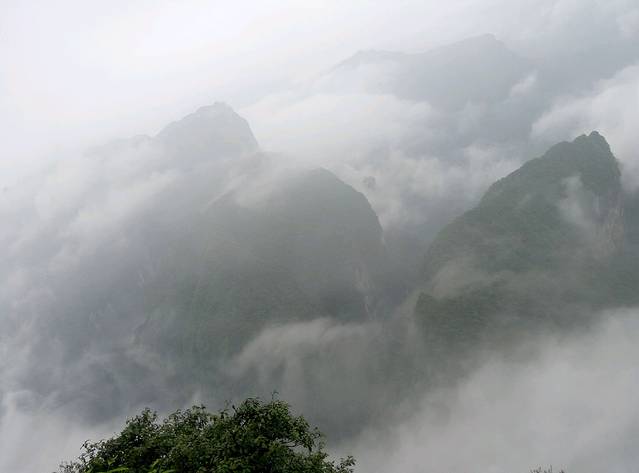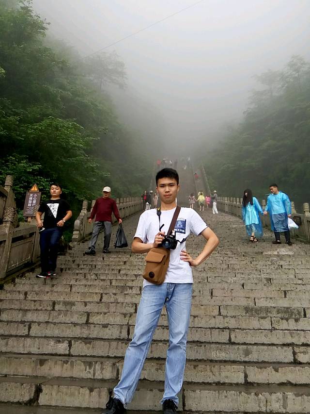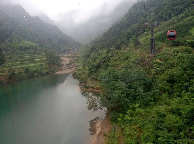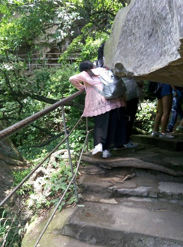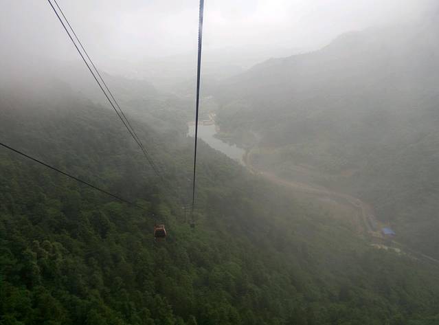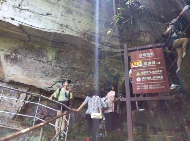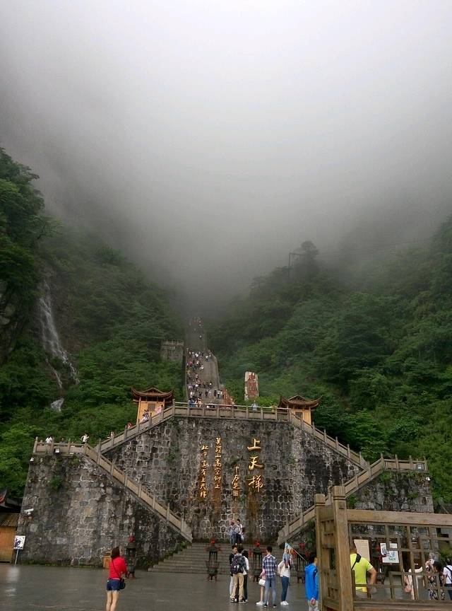 准备下来的时候下起小雨,雾气比早上大,现在洞口下方都不知道,可悲呀,慢慢地走天梯下去,途中不断回头看雾还是不散,直到走下999级阶梯了,才见雾开始被风带走一点了。想起时间下午4点还早,坐车下山便是客栈,所以决定坐等雾散看洞现,一个小时过后果真清晰许多了,来拍几张照片,乘环保车穿梭通天大道下山。