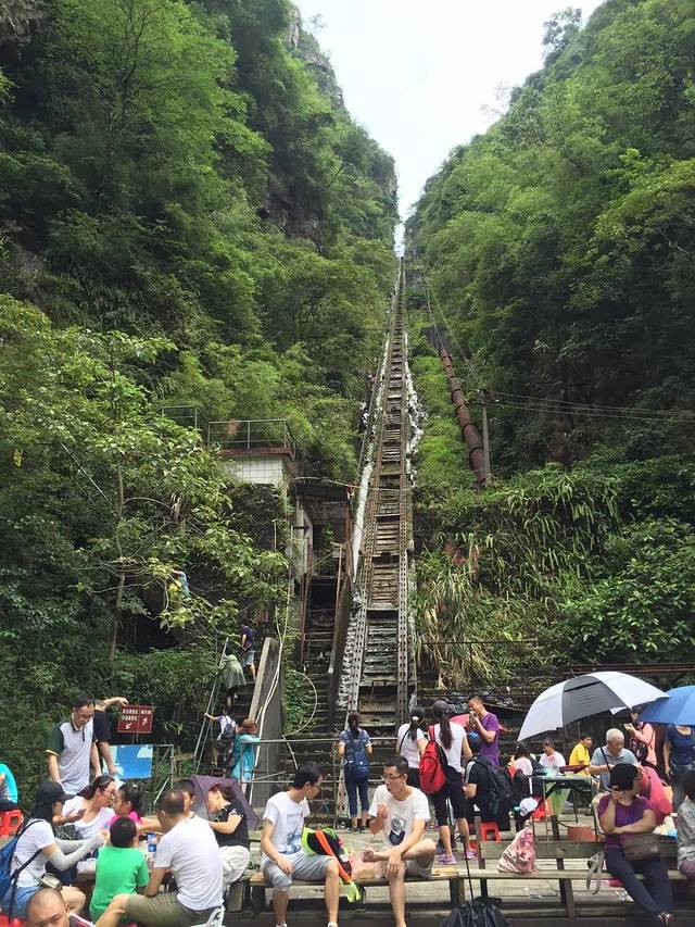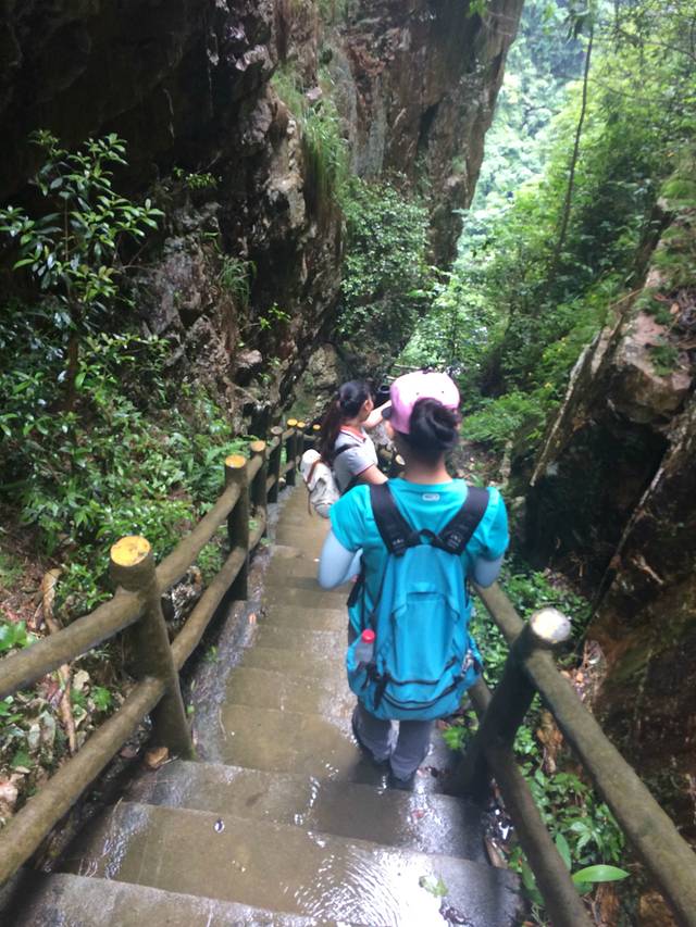 通天梯,1368级,走完之后人生感悟都上升了,俩小伙伴不断地边鼓励自己边讲哲理。我们选的是完美穿越路线2,走通天梯回到谷口广场,走完1368级,很累而且中段还有水流下来,只能撑伞或者穿雨衣通过,要不就只能像我们一样,完全湿身。人多,不少人走着走着会停下来休息,刚好到有水的地方,路窄只能淋着。山泉水,淋着也停降温