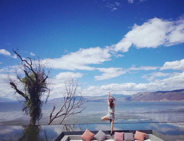 这张就是环海时,洱海边拍的,许久不练,柔韧性不够啊,再加上脚下站的地方不稳,这个动作不到位。