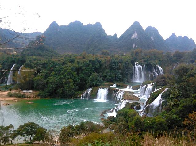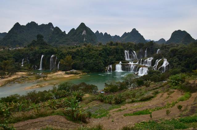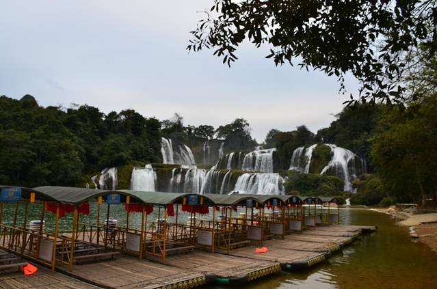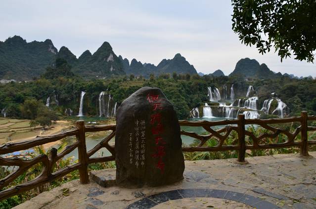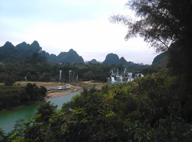 德天瀑布位于广西崇左市大新县硕龙乡德天村,中、越边境处的归春河上游,与紧邻的越南板约瀑布相连,是亚洲第一、世界第四大跨国瀑布。虽然是冬天,但德天瀑布依然用无以比拟的魅力征服了我们。远看婉约秀丽、近看气势磅礴,不同角度、不同的美景。特别推荐,一定要乘船近距离感受德天瀑布带给人的震撼之美。瀑布周边的山坡,绿树成荫,山花烂漫,风景也是极好的。远眺对面的越南,别有一番感触。归春河面上,越南妇女操着流利的中文向游客推销越南产品,主要是香烟、香水、红木小饰品、各类膏药(油)等,有些东西看起来还不错。是否购买,就看个人抗拒诱惑的能力了。
