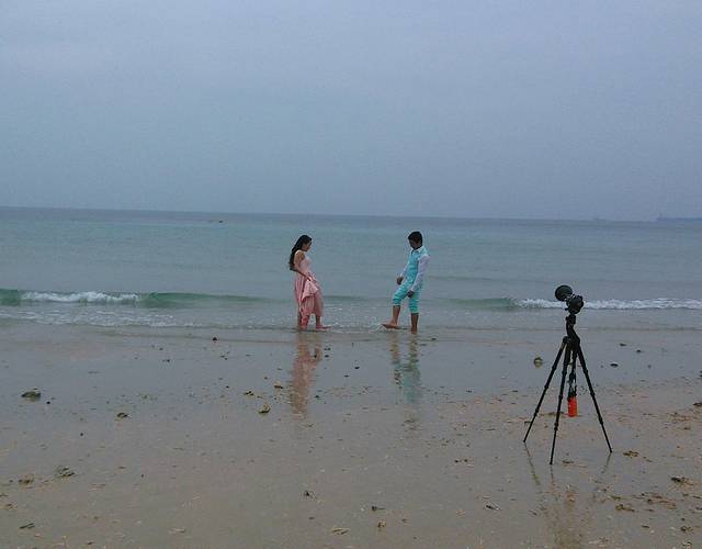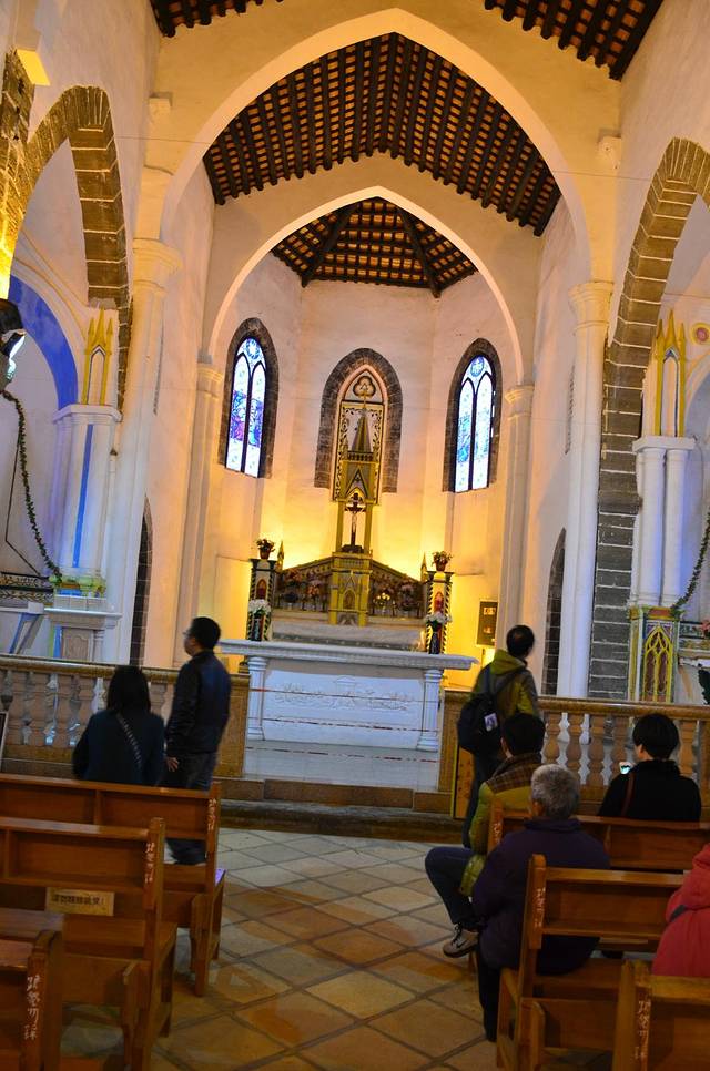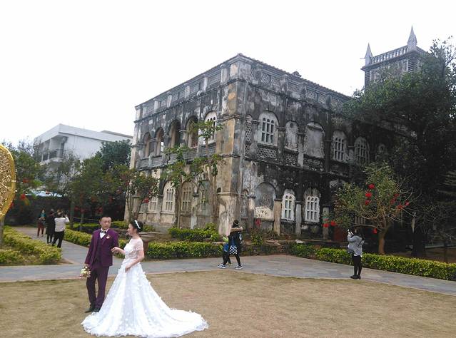 教堂里拍婚纱照的新人。执子之手,与子携老。