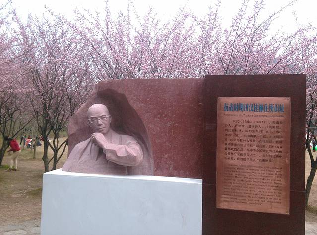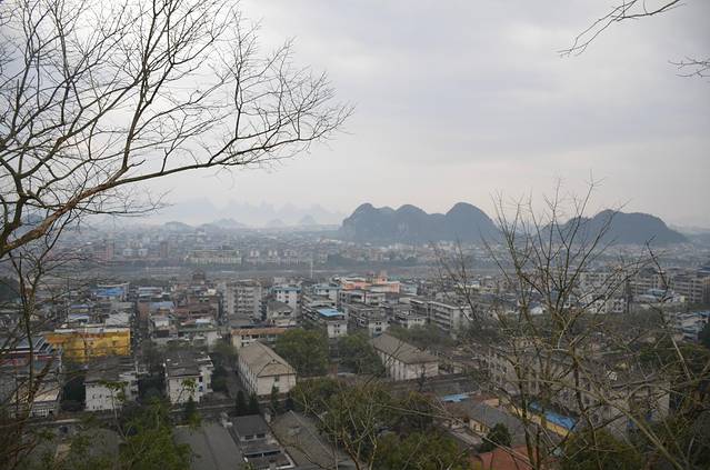 独秀峰,孤峰突起, 气势雄伟,有"南天一柱"之称,据说冠压桂林诸峰。又名紫舍山。崖上石刻很多。仅一通道直达山顶,山路陡峭,山顶古松苍天。登山远望,桂林市风光尽收眼底。