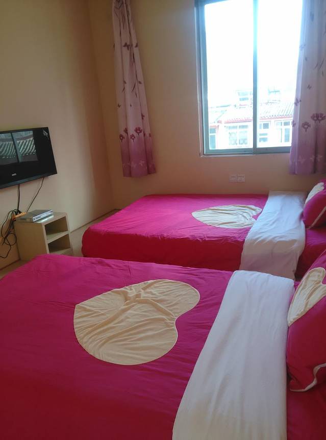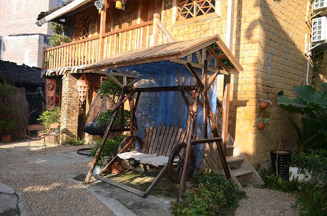 住在一个和名字一样雅致的小客栈,一楼的小餐吧,庭院里的树木花草、摇椅,过道上摆放的酒坛、墙上的挂饰都体现了店主的一番心思。房间是三层木质阁楼,我们住在三楼,除夕80元/间,初一380元!唯一的不足是房间电视无有线信号,老人家的除夕晚会只能在手机上看了。有图有真相。