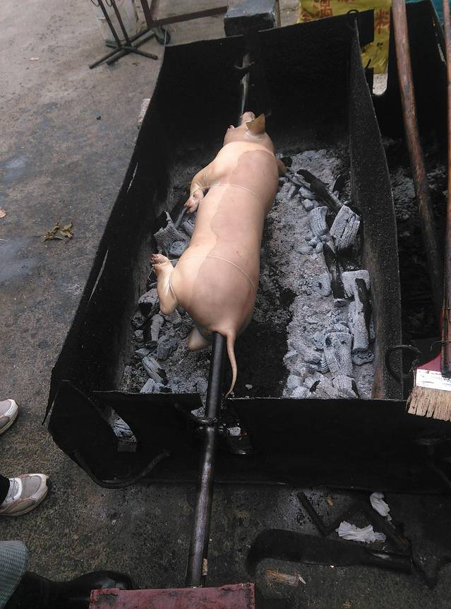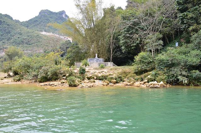 继续9点上路,南宁到大新县名仕田园,200公里,高速公路一个多小时到崇左,然后再次踏上坎坷的征程。崇左到名仕田园一段路,虽然路况不理想,但沿途片片蔗林,风景很美。下午1点多到达明仕田园景区,农家饭店在路边明火烤猪、烤鸡、烤鸭,就地解决午餐,烤猪,味道还不错,主要是乡下的青菜、豆腐确实好吃。明仕山水田园风光集中在明仕至拔浪一带,号称小桂林。风景区河段长约8公里,门票120元/人船票包观看表演,由于开发时间较晚,虽是商业运作,但感觉不错。乘船浏览,看山清水秀,山环水绕,听路边壮歌缭绕,倒也怡然自得。美中之足的是,接泊的车辆安排不合理,上船码头还未建好,下车后要走很长一段路才到一个异常简易的渡口乘船。不过导游小姑娘讲解不错。