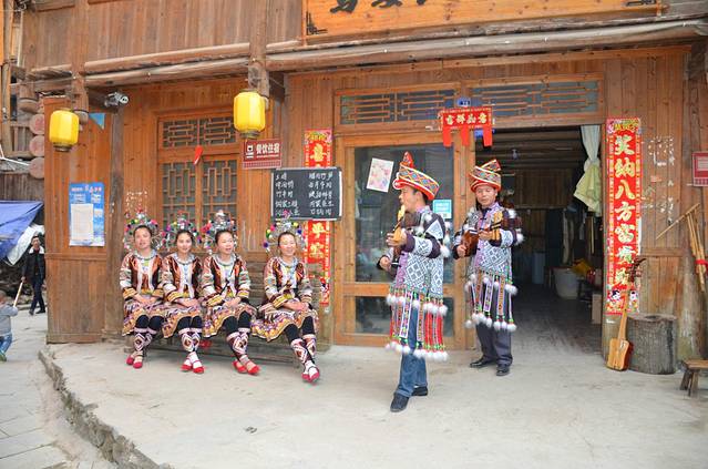 路边客栈的阿哥阿妹边弹边唱侗族大唱,犹如天籁之音,吸引了游人将路挤得水泄不通。
