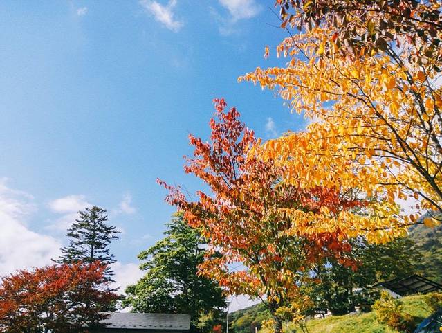 国庆期间的红叶并不是全红的(请参考上面红叶见倾图),全红的后果就是堵车再堵车、大人潮,所以有一点变色就好。再加上今年是暖秋,其实并没有报什么希望见到红叶的,但是看到的时候已经很满意了!红+黄+绿,层层叠叠的太美!