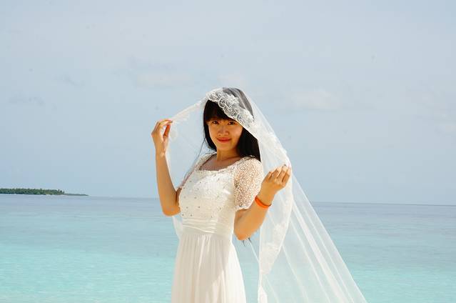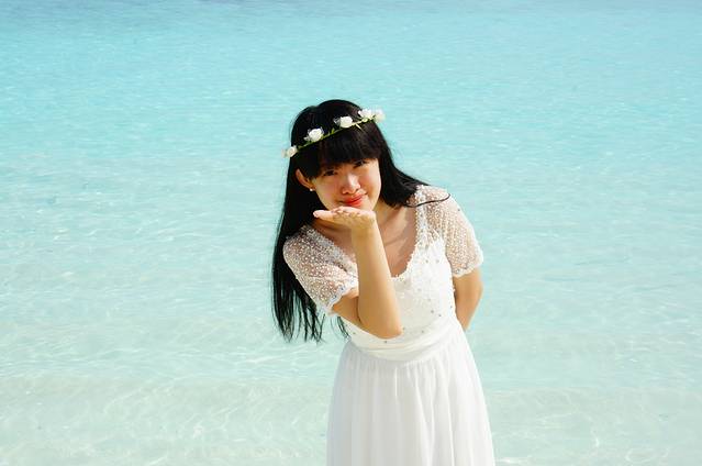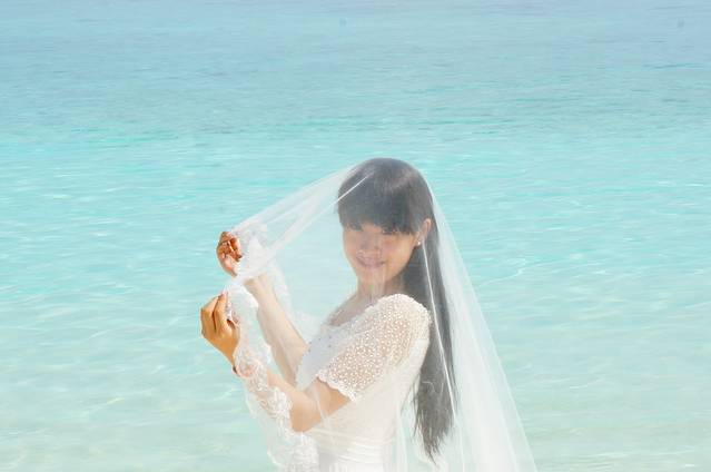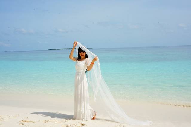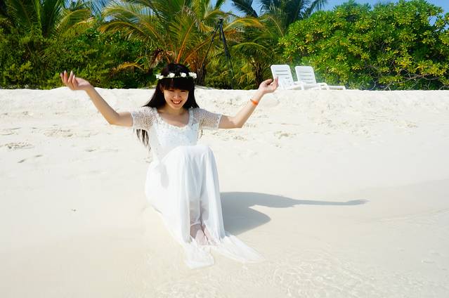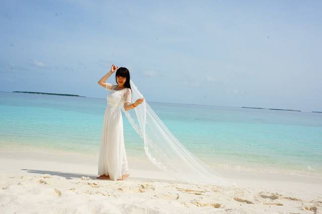 在沙屋的最后一个上午啦~穿上婚纱,赶紧来拍拍照!在这里提醒大家,如果想要拍照,一定趁着还在沙屋的时候拍,等搬水屋了,整天在海里泡着,真的没有什么心情再来拍照了呢~