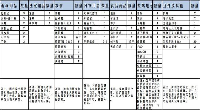按照这张图来准备,就绝对够用了!特别提醒,防晒霜一定得带高倍的,我们带的是水宝宝,资生堂蓝瓶(超级推荐,新加坡机场买的新品,国内貌似还没有卖的,质地像涂改液,防水防汗防油),香蕉船和无数的面膜,没有晒伤,而且没有怎么黑呦~~