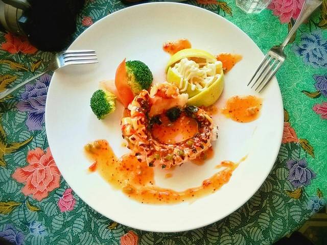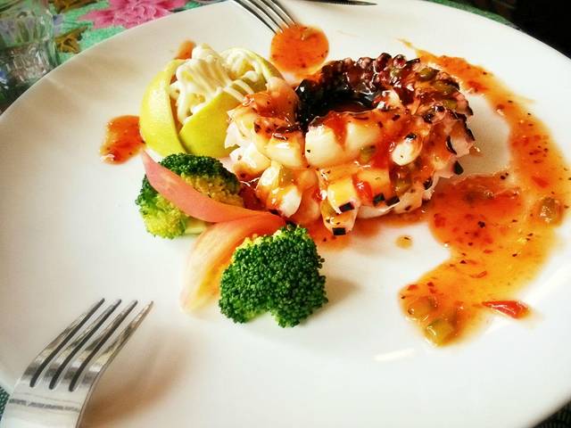 在琢磨着吃什么特色菜的时候,看到别桌端上了一盘好大的章鱼须,“嗯,就是它了!”说起来还是第一次看到整条那么大的章鱼直接在一盘子的料理。酱汁类似泰式甜酸酱,酸酸甜甜很是开胃。58RMB一盘,稍贵但值得一吃!