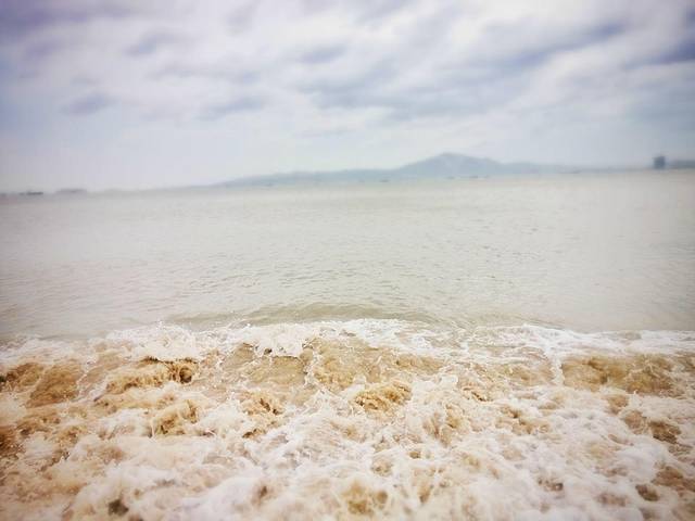 当天因为台风将至的缘故,风有点大,浪也有点大,只能在边上让海水冲刷脚丫子了