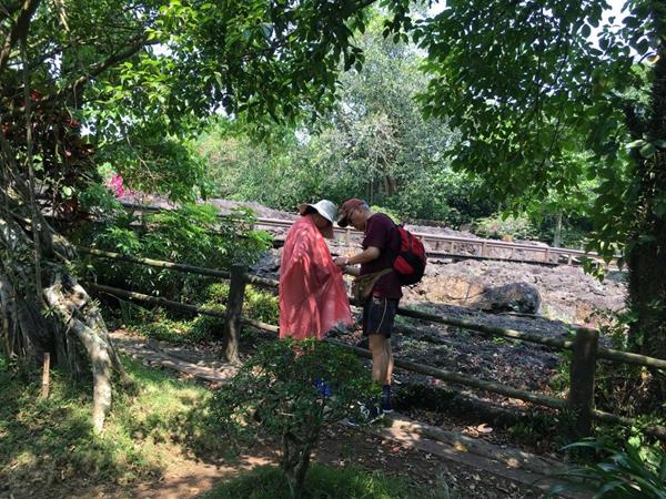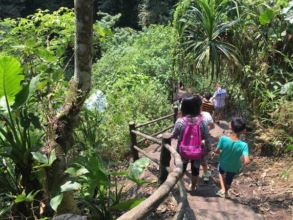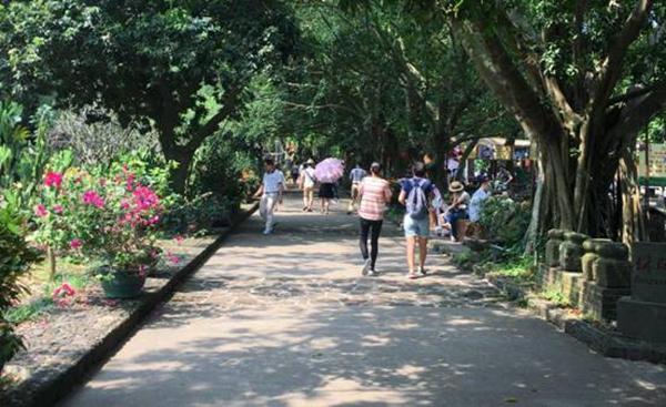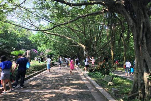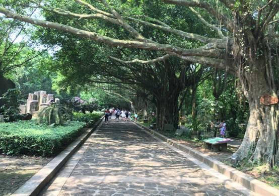 来这里犹如给我们上了一节科普课,民族风情美食街也是一个生态园,这里种植着各种各样的热带植被,种类丰富。此林木名为杜英,为常绿乔木,成长后巍峨壮观。4-5月开花时节,犹如悬挂了层层白色的流苏,迎风摇曳,并散发出奶油味的香气。