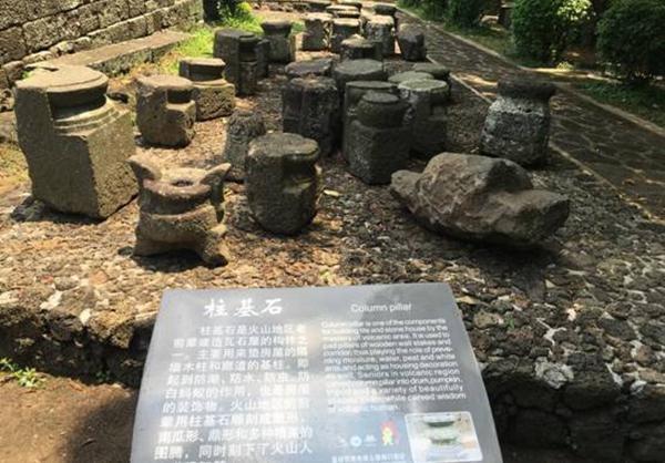 顺着假山喷泉的左方走上台阶,我们就来到了民族风情美食街的正门,与南渡江畔仅一条马路之隔。正门前的广场上还有刻画着黎苗族人欢乐舞蹈的碑石。