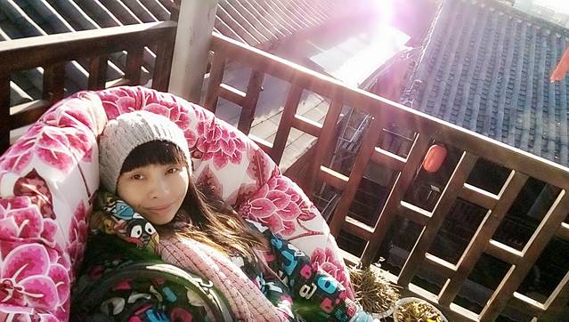 逛回客栈本来坐在庭院里的摇椅上,清洁阿姨建议我到楼顶上去烤太阳,还说我们这里的太阳烤着可舒服啦。听了阿姨建议爬上楼顶,躺在沙发上尽情烤太阳,这里白天的天气真的是太好,每天都蓝天白云,虽然晚上很冷(PS:几天玩过后得出结论,束河、大理、双廊这几个地方,束河晚上是最冷的)