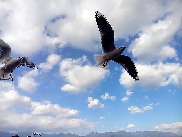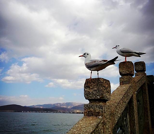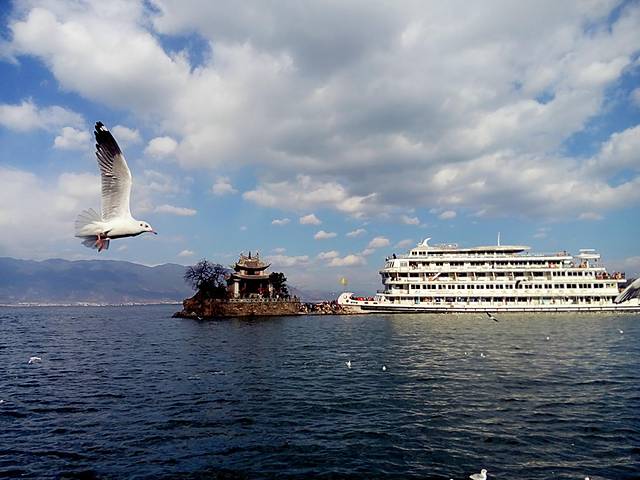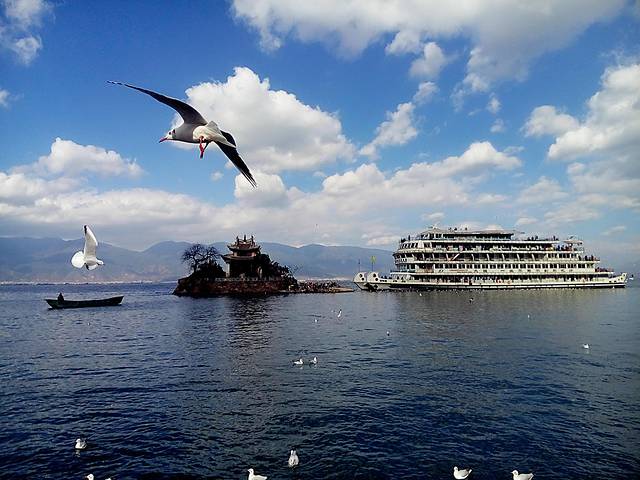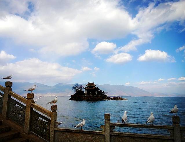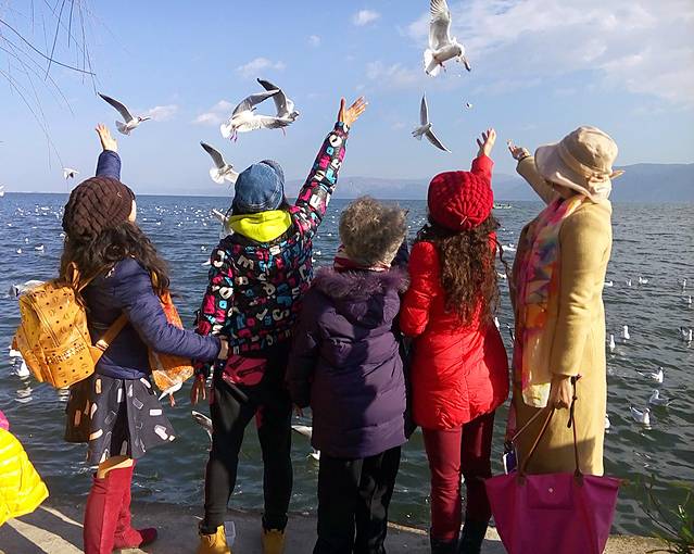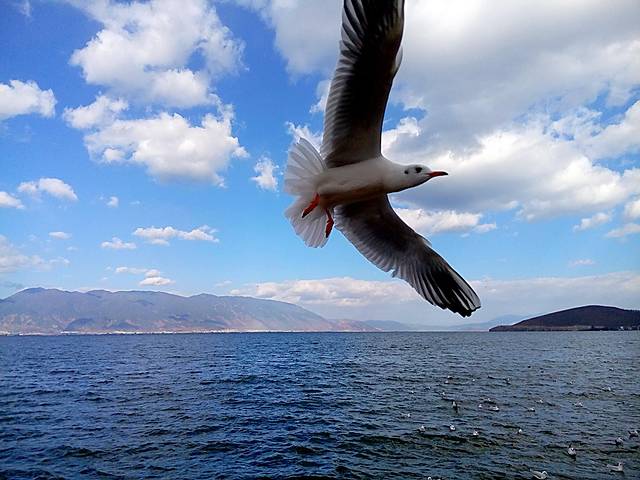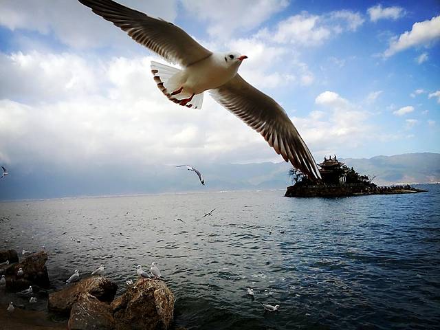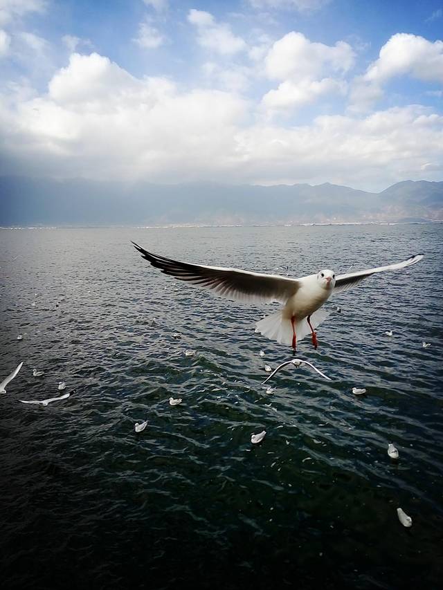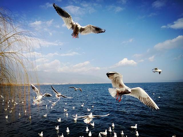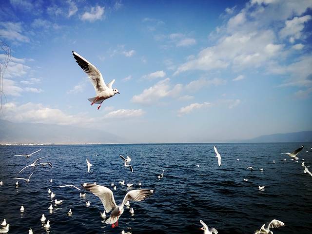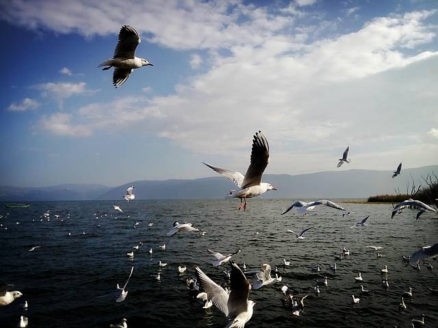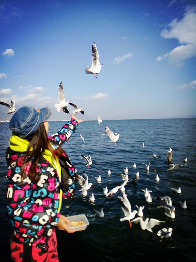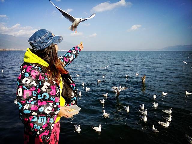 从大理古城出发没多久到了马久邑,在车上远远就看到这里的洱海边有海鸥在飞,不少人在喂海鸥,我们也立马下车加入喂海鸥的行列,小苏介绍听说这些海鸥是从西伯利亚飞过来越冬的,在每年12月到第二年2月都能在这里看到海鸥,双廊那边另一个地方小普陀也有,这里的海鸥有点胆小,拿着饼干喂它们,它们会小心翼翼的飞来叼走,挺好玩的,这里洱海水干净,海鸥可爱,晒着太阳喂海鸥真是件放松开心的事