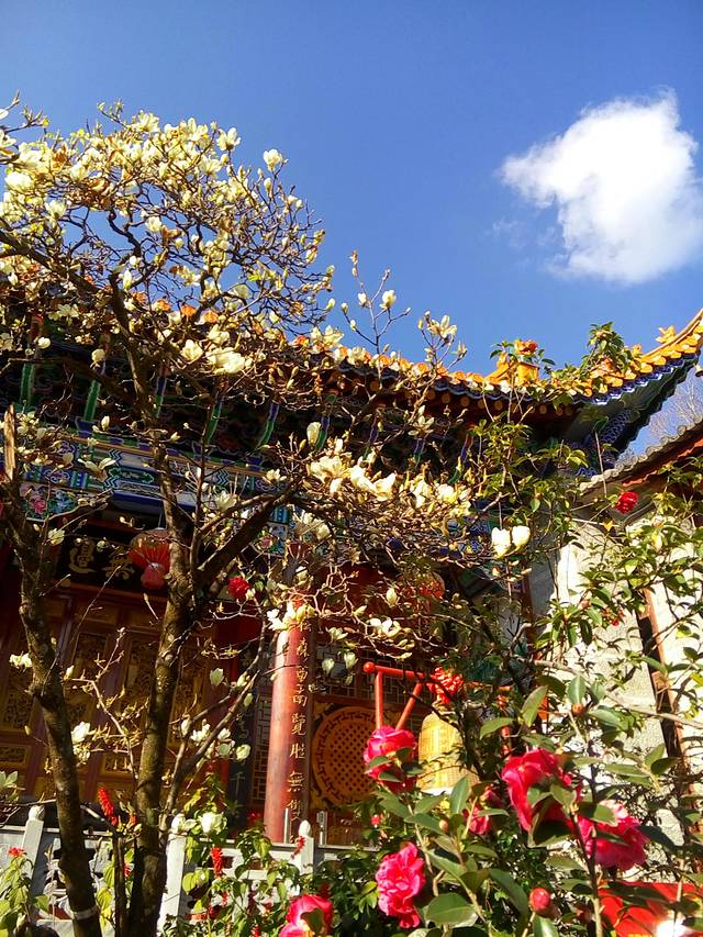 爬了一小回就到了感通寺,进去看了看,玉兰花和月季相映衬开得很漂亮