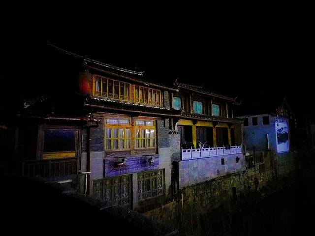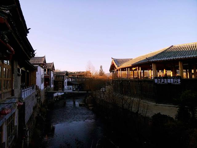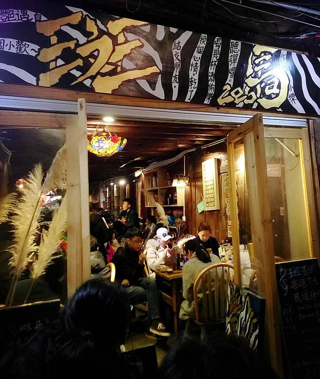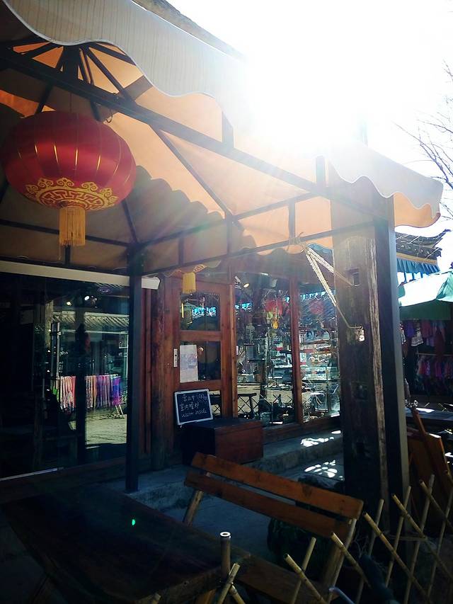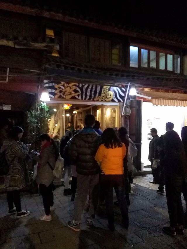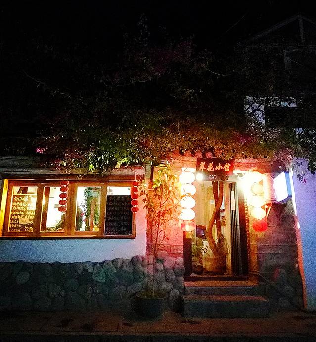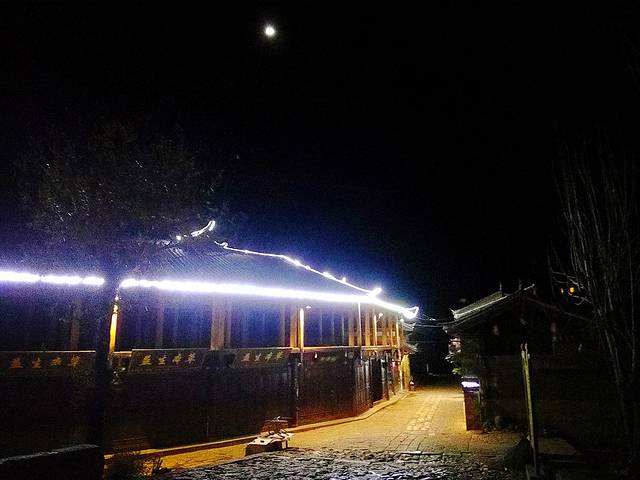 束河古镇跟丽江古城相比果然是个比较安静的古镇,夜里11点的街道上几乎都关门闭户,黑灯瞎火,而且这个季节晚上温度大概是零下4度左右,对于来自重庆的我们感觉冷得有点僵了,还好没走多远就看到唯一一家有灯光的酒吧传来吟唱的歌声,立马过去(PS:其实在酒吧街那边晚上应该还有夜店开着,只是我们夜里到束河不太清楚方向和位置,只是在附近不远处找,没到酒吧街那边)