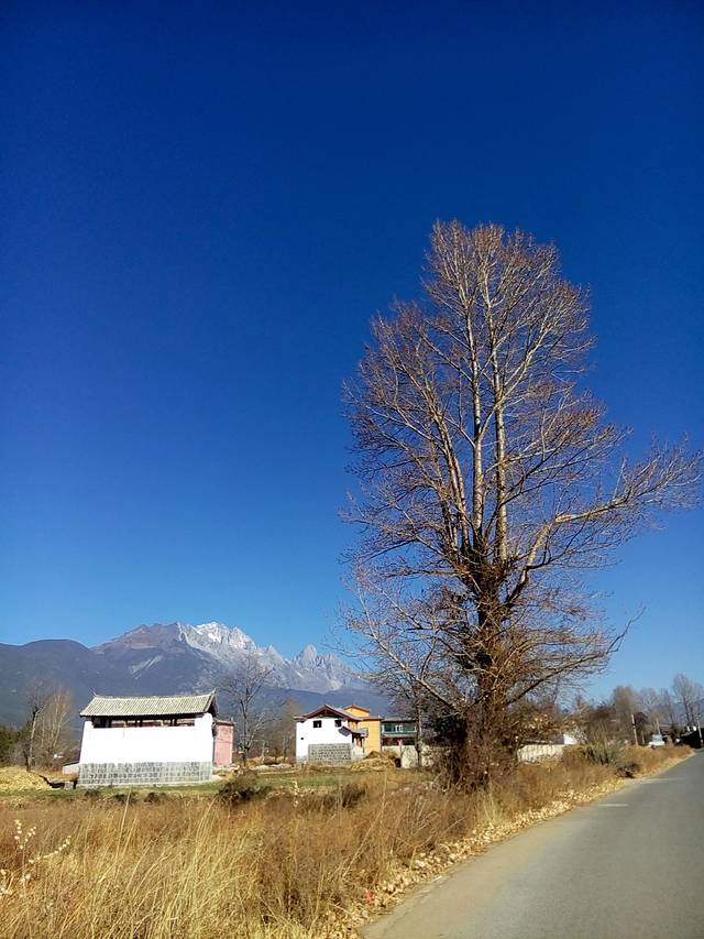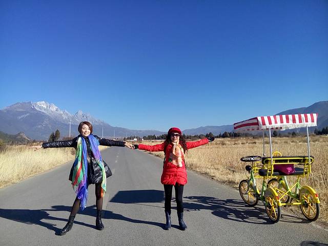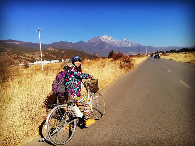 平坦的路面,轻快的骑行,蓝天白云下远处是玉龙雪山,一路向前
