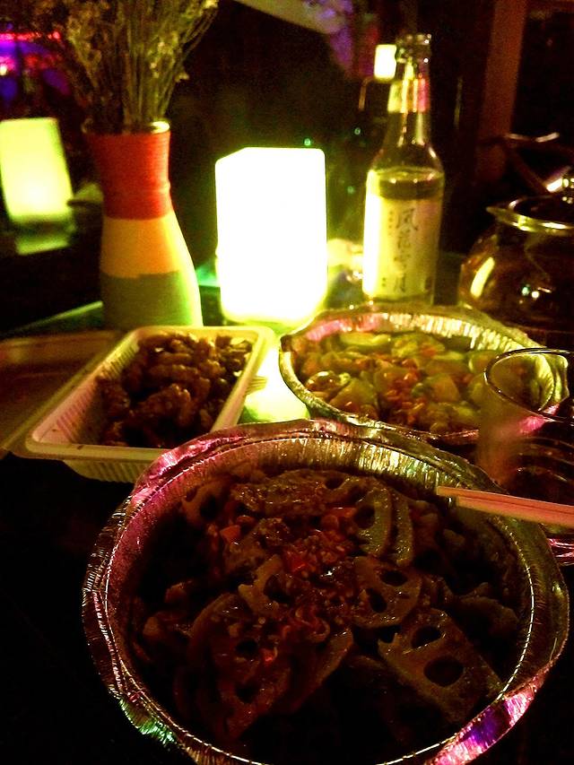 烧烤的藕特别香辣爽口,就着“风花雪月”(丽江这边的一种啤酒),还有一壶味道非常甜香的玫瑰茶,听着音乐边吃边喝真是安逸