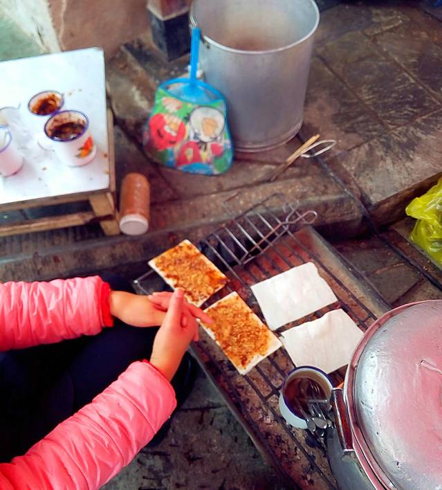 街边的烤饵块,老板让我们自己放调料,抹上各种酱裹上油条咸香有嚼头