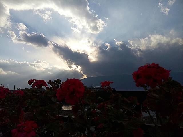本来打算在楼顶欣赏落日,可惜夕阳躲在云后,只欣赏到霞光