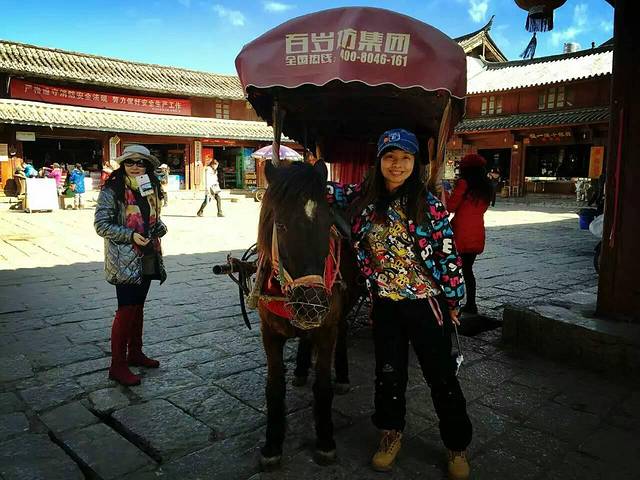 我们要到束河古镇的正门坐车到大理,从客栈到古镇正门还有一段距离,拖着行李箱在青石板路上走相当困难,大家干脆坐马车带上行李,顺便还逛古镇,虹出的这个主意真好