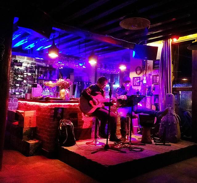大石桥边上的“简遇吧”,正好这天晚上老板的几个朋友在这里自娱自乐,喝酒唱歌,所以酒吧还开着,可能平时这个季节没生意晚上是不开门的