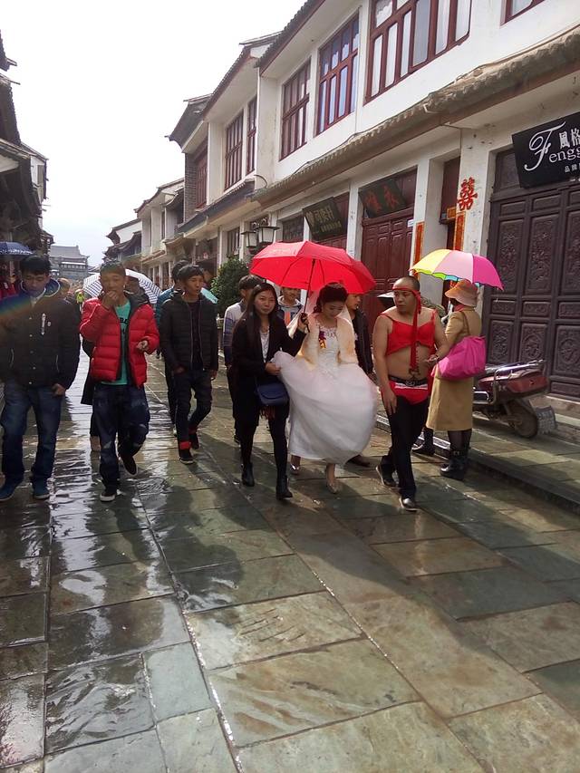 走在古镇里正好看到一对新人在游街,听小苏介绍说大理这一边结婚习俗是要戏弄新郎的,怪不得看新娘子穿着婚纱很漂亮,而新郎却是穿得很搞笑