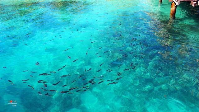 中午时分,栈桥边的海水是最漂亮的。看小朋友在浮潜逗鱼。