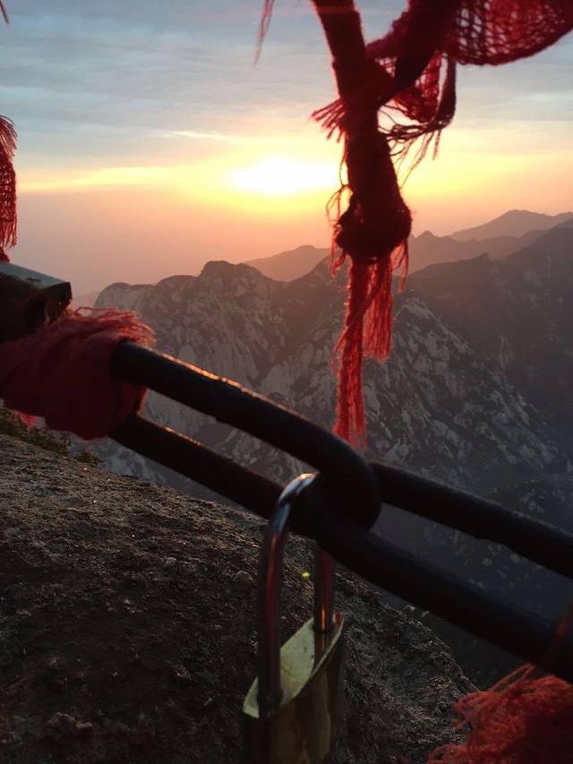 从这个角度看日出有一种暖心的美,恋人们绑上的锁子在晨光中,逐渐褪去了冰冷的气息。上部的红绳在山风中飘扬,远处大山的背景下,它们独特而又充满温情。