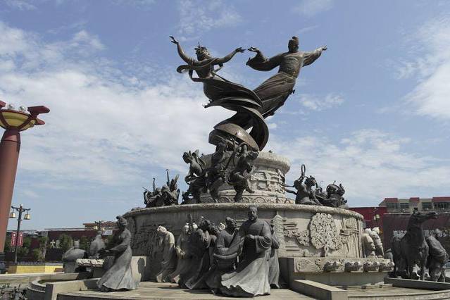 华清大广场,华清宫外面的一个广场。唐玄宗和杨玉环的缠绵悱恻!蓝天白云下,阳光刺眼,我看不清雕塑上他们的表情,千年前的他们以生死离别结束爱情,千年后的他们在这里相聚,再也不用分离。