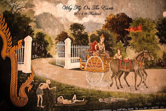 这幅图讲述了佛祖当年还是太子的时候,出游遇到了生老病死,而心生大慈大悲。