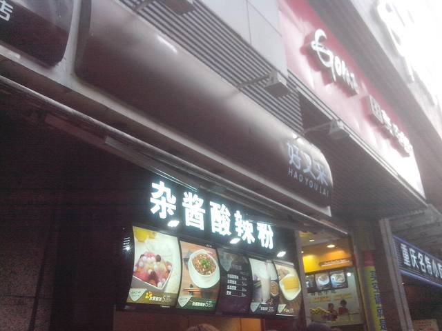 收拾一下就出门了 目的地 解放碑 上了轻轨就开始好兴奋 我发现我对新东西爱兴奋 饿死了 直奔酸辣粉 解放碑附近的好又来酸辣粉 酸辣粉啊酸辣粉 又饿又馋 终于找到了还要排个大队 味道呢 就是酸辣粉的味道了 麻辣香比较重 这边的东西基本都是这样 还好 没太惊艳也不失望 只能这样评价 还吃了串炸螺肉 不错